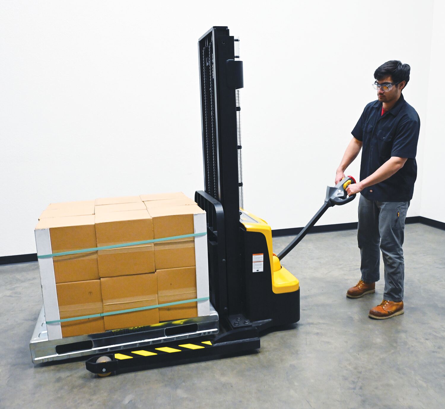 The double mast fully powered electric stacker transports loads throughout warehouse facilities quickly and with less effort. High torque drive and lift motor handles heavy duty jobs. Ergonomic handle features lift/lower controls, proprietary safety enhancing emergency reverse function, and horn. The unit includes an electromagnetic disc brake with automatic dead-man feature. Powered lifter has two 12V lead acid deep cycle batteries, integral battery charger, and a battery level gauge.