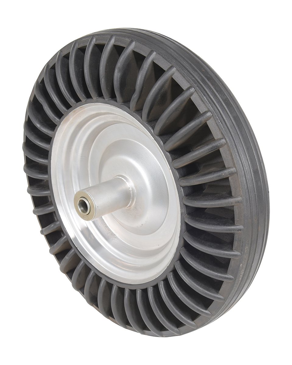 Mold On Rubber Shock Absorbing Wheel 16 In. Diameter 330 Lb. Capacity Black/SilverThis shock-absorbing wheel with special design for shock absorption properties prevents wheels from bouncing like standard pneumatic wheels. Solid black molded rubber tread will never go flat. Steel hubs (symmetric style for wheel barrels) for maximum strength and precision bearings.