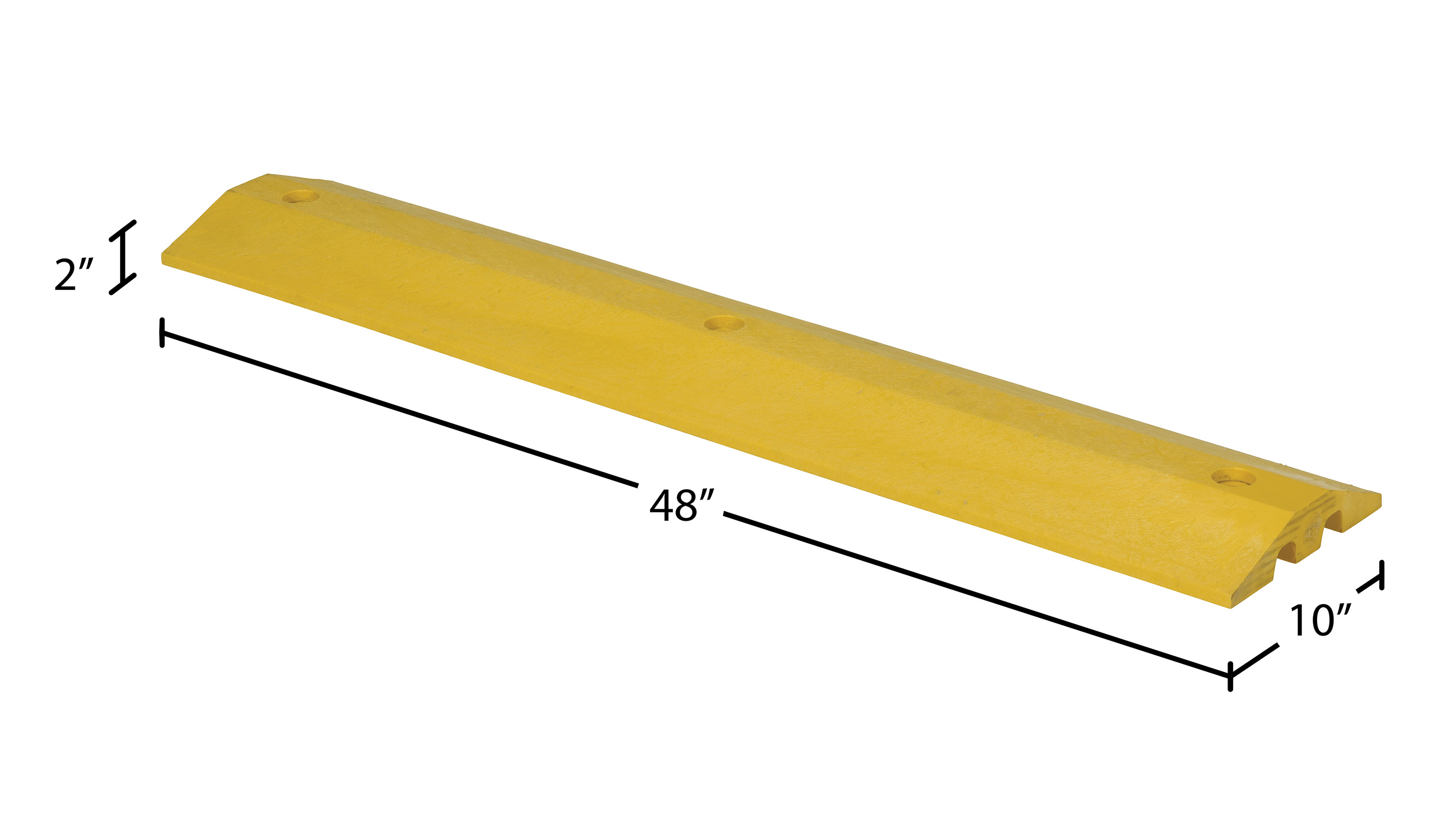 Plastic Speed Bump Concrete Hardware 48 In. x 10 In. x 2 In. YellowThe speed bump is ideal for a variety of parking areas, both inside and out. The speed bump helps to control drivers from injuring people and property. The unit can be installed/removed by one person resulting in smooth portability. The strong recycled plastic construction can be used where traffic is frequent and can hold up to the constant day to day harm from chemicals and sunlight. Features a dual cable channel. The concrete hardware kit includes bolts, anchors, and washers.