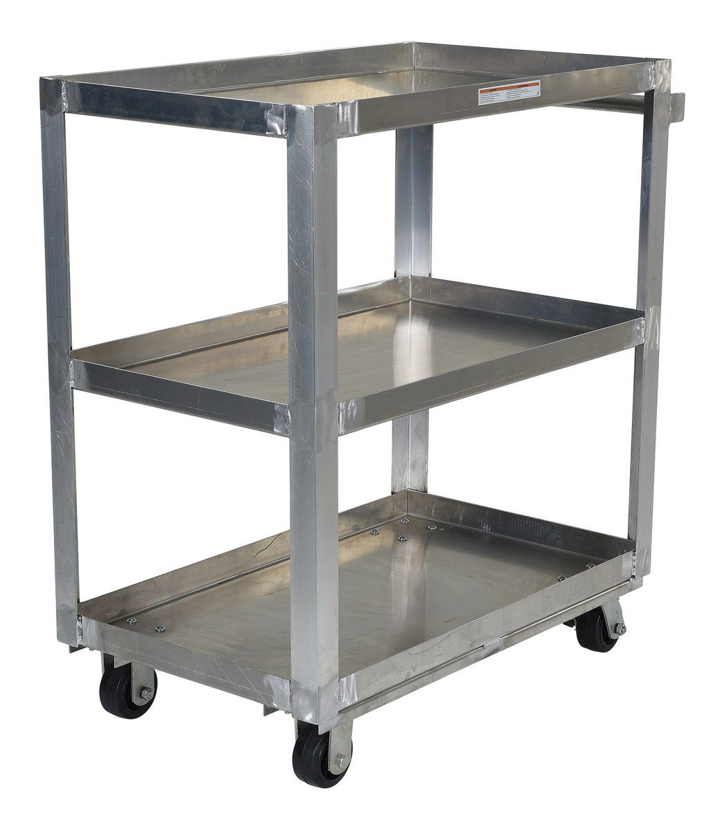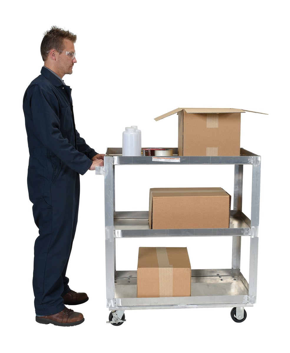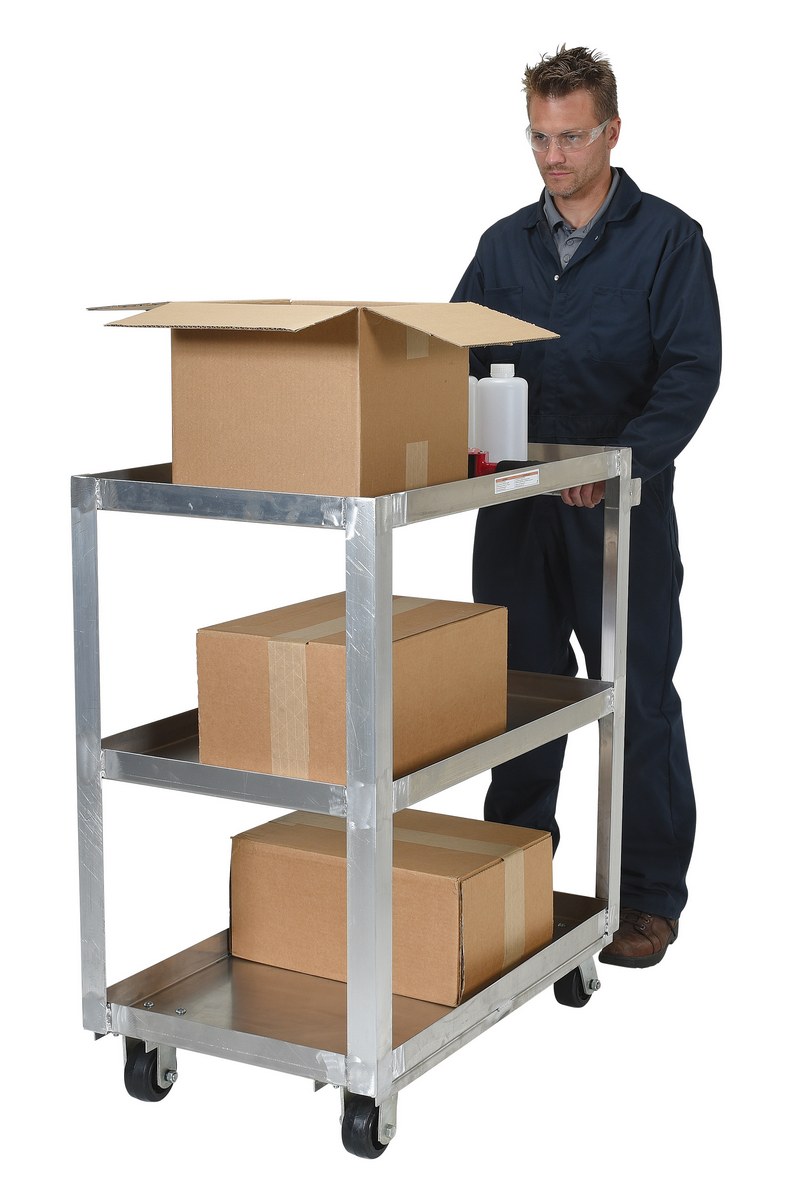 Aluminum Service Cart 3 Shelves 35-7/8 In. x 21-15/16 In. x 41-3/4 In. 660 Lb. Capacity SilverAll welded service cart, made of aluminum is ideal for transporting parts and boxes. This unit has three (3) shelves, a lip is turned up on all shelves to prevent items from sliding off.