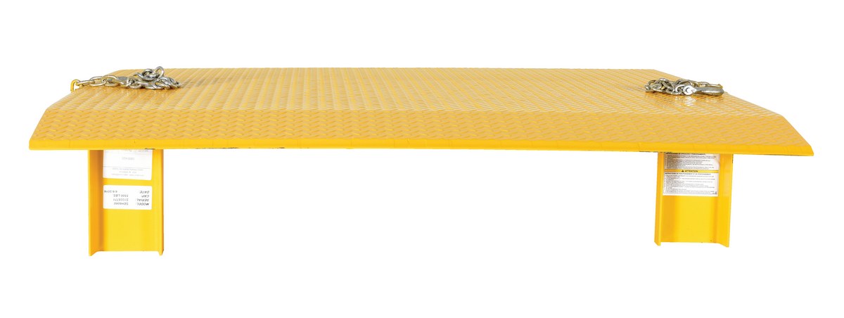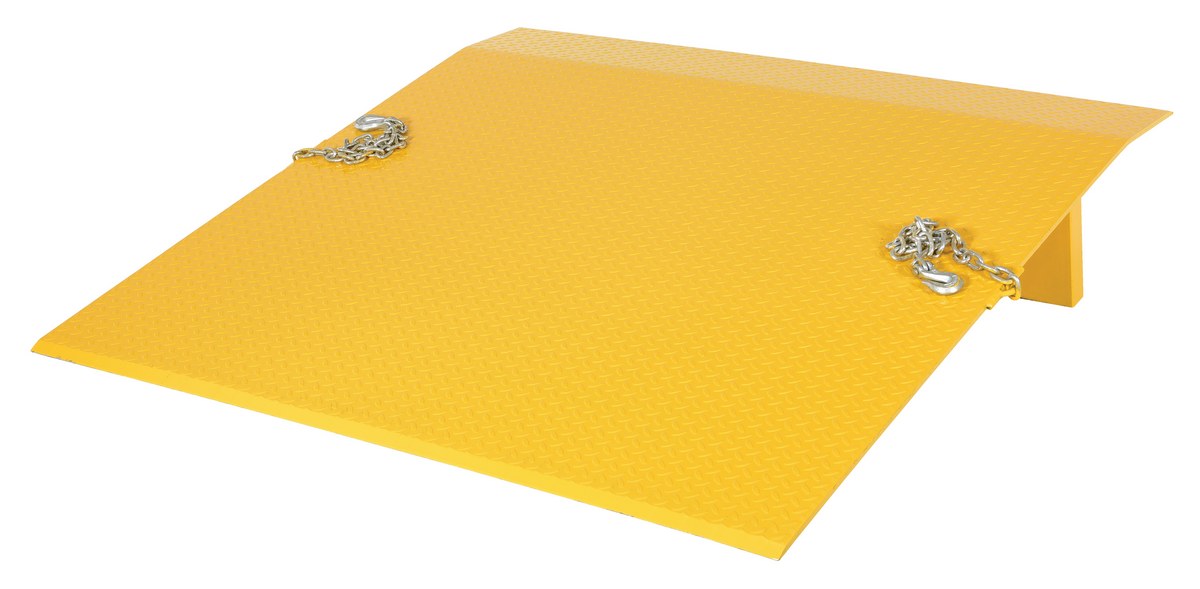 Steel Truck Dock Plate 60 In. x 60 In. x 12-5/8 In. 5,500 Lb. Capacity YellowThe steel truck dock plate is constructed of high strength INX-55 (55,000 psi) steel. Safety locking legs prevent slippage between truck and dock. Safety tread plate helps provide positive traction. Beveled edges for smooth entry and exit. Chain pickup comes standard. Designed with an 11 degrees bend located 9" from the beveled edge. The legs are 10" from the beveled edge. Manufactured in compliance with OSHA. When using three wheeled pallet trucks, select capacity +20% due to concentrated load center of board.
