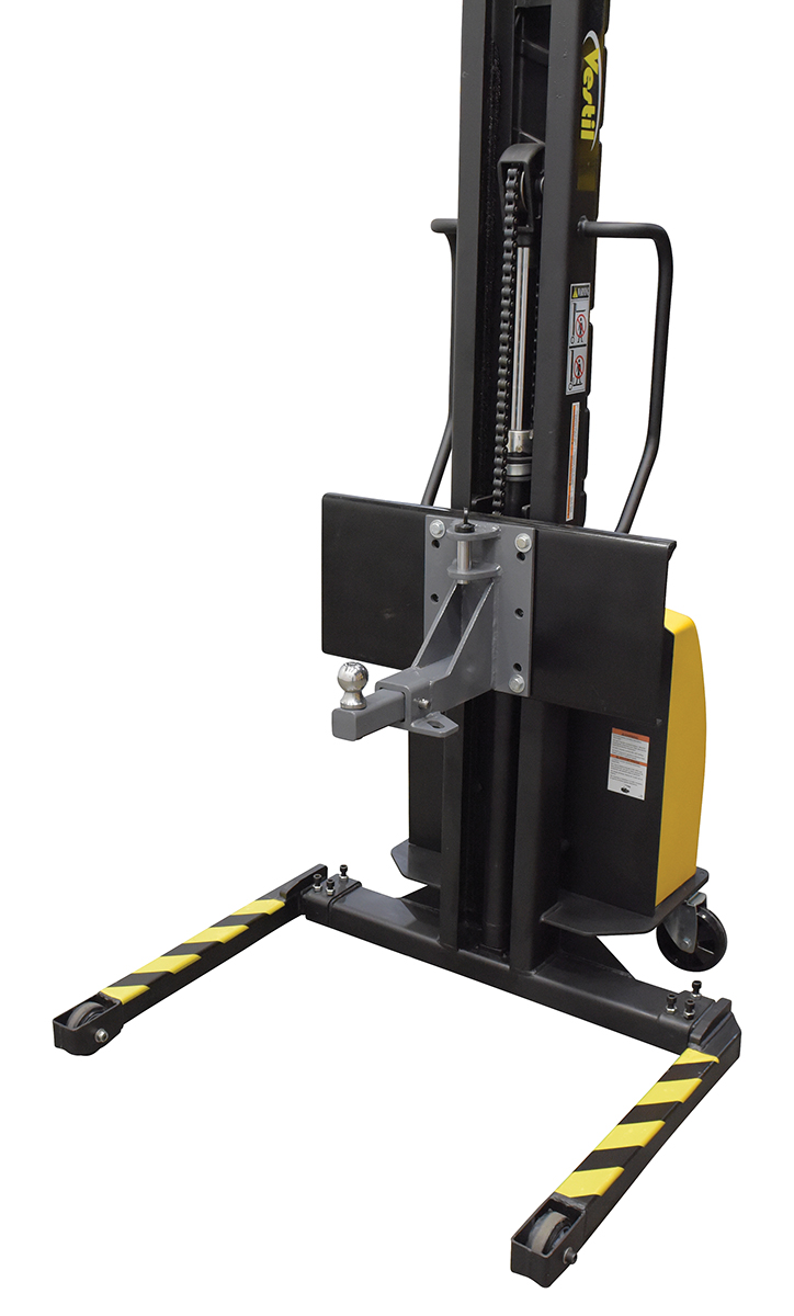 Steel Single Ball Hitch Attachment For Narrow Mast Stacker Models BlackA single ball hitch is a durable accessory for the counter balanced powered lift. The unit as a whole is attached to the mast of the lift with a bolt and nut connection. With a unique design style, the hitch can be secured into and disconnected from the receiver with ease. An additional pin, secures the hitch into place minimizing any jostling or movement. The hitch is extended away from the mast of the unit giving much needed space when maneuvering the hitched products. Black powder coat finish for baked in added toughness.