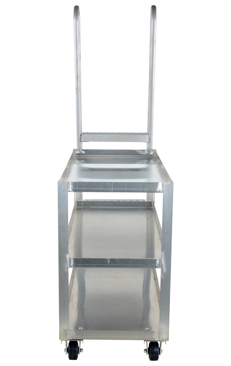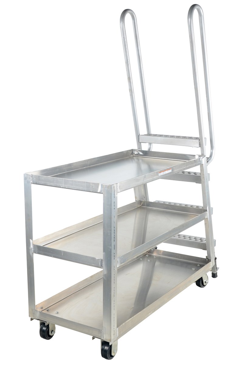 Aluminum High Duty Stock Picker Truck with Steel Ladder 56 In x 21-7/8 In x 73-5/16 In 500 Lb. CapacityThis oversized hi-duty stock picker truck is perfect for large jobs. Ideal for oversized cartons, boxes, parts, and supplies. A spring loaded steel ladder for sure, safe climbing, and loading. Steps have non-skid footing with self-cleaning surface. Each unit features three (3) shelves. Ladders have a baked in silver powder coated finish.