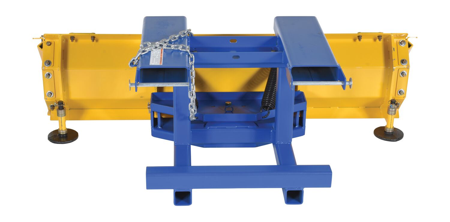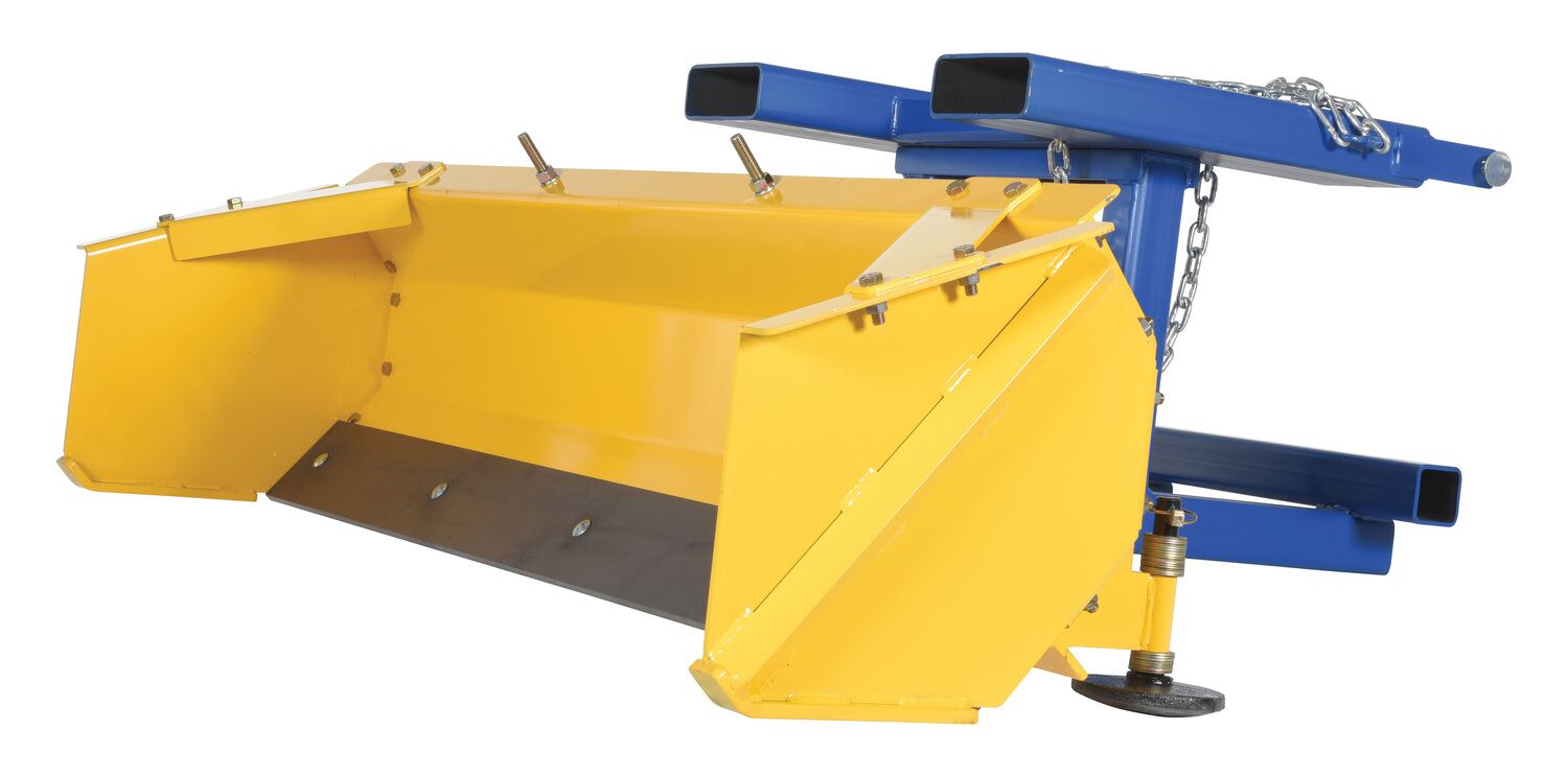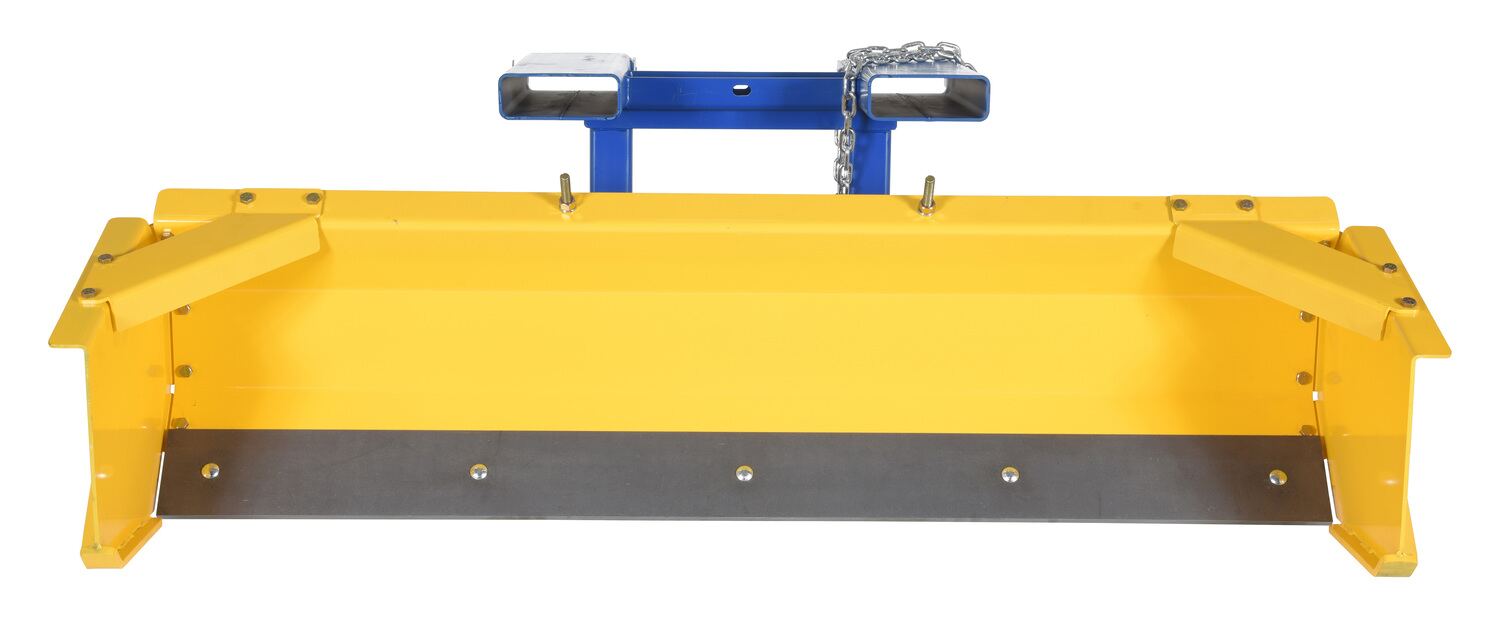 Steel Snow Plow Fork Mounted Push Box 72 In. Blade Width Blue / YellowUnique design attaches to fork truck forks. Pass through fork tubes keep weight back towards fork truck mast. Locking pins secure snow plow to forks for safety. The steel construction has a brightly colored baked-in powder-coated finish for added toughness and clear visibility. The attached sides contain the snow in a direct manner for time and safety efficiency.