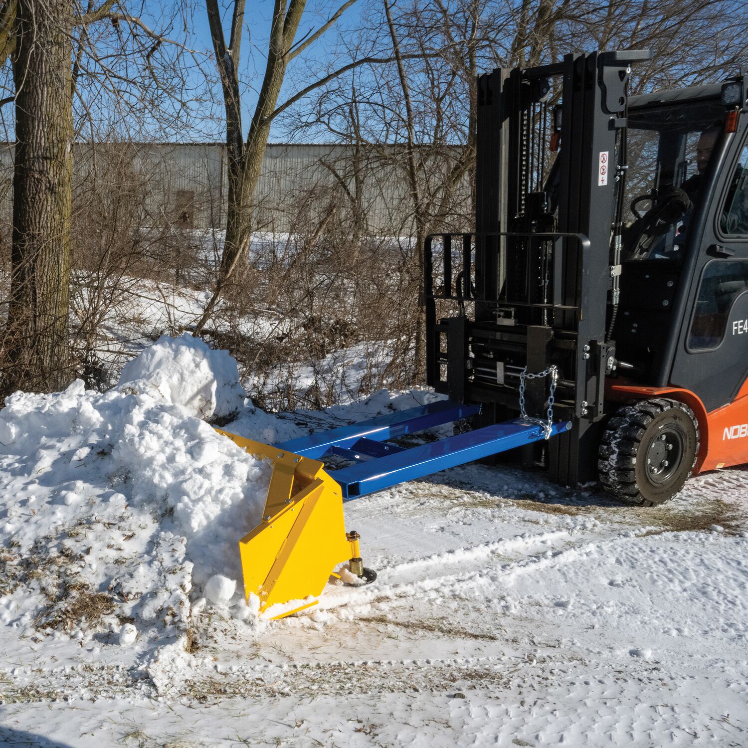 Steel Fork Mount Snow Pusher 72" Blade Blue/YellowWhen snow needs moved and removed, look no further than the fork truck snow pusher. The unique design attaches to fork truck forks, so no power supply is needed! With a manual pivot mechanism, blade rotation to both the right and left are simple. Steel construction with baked in powder coat finish for added toughness.