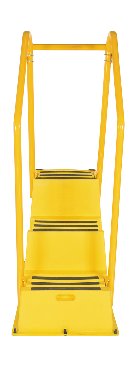 Polyethylene Nestable with Hand and Back Rails Casters 3 Step 500 Lb. Capacity YellowA poly step stool is a great asset for on the go or in a permanent setting. A lightweight design with front and side cutout handles, allow the user to easily transfer the stool to a preferred spot. The taped step surfaces ensure safe footing while traversing up and down the steps. Includes bolt on back rail, handrail, and casters. The hand rails height allows the unit to be pushed or pulled into the desired position, minimizing bending and twisting by the user. Steps can be nested to minimize footprint when not in use.