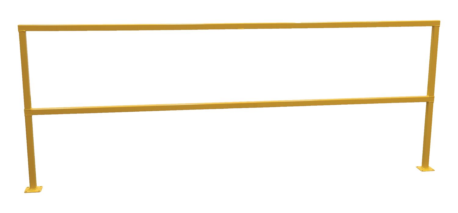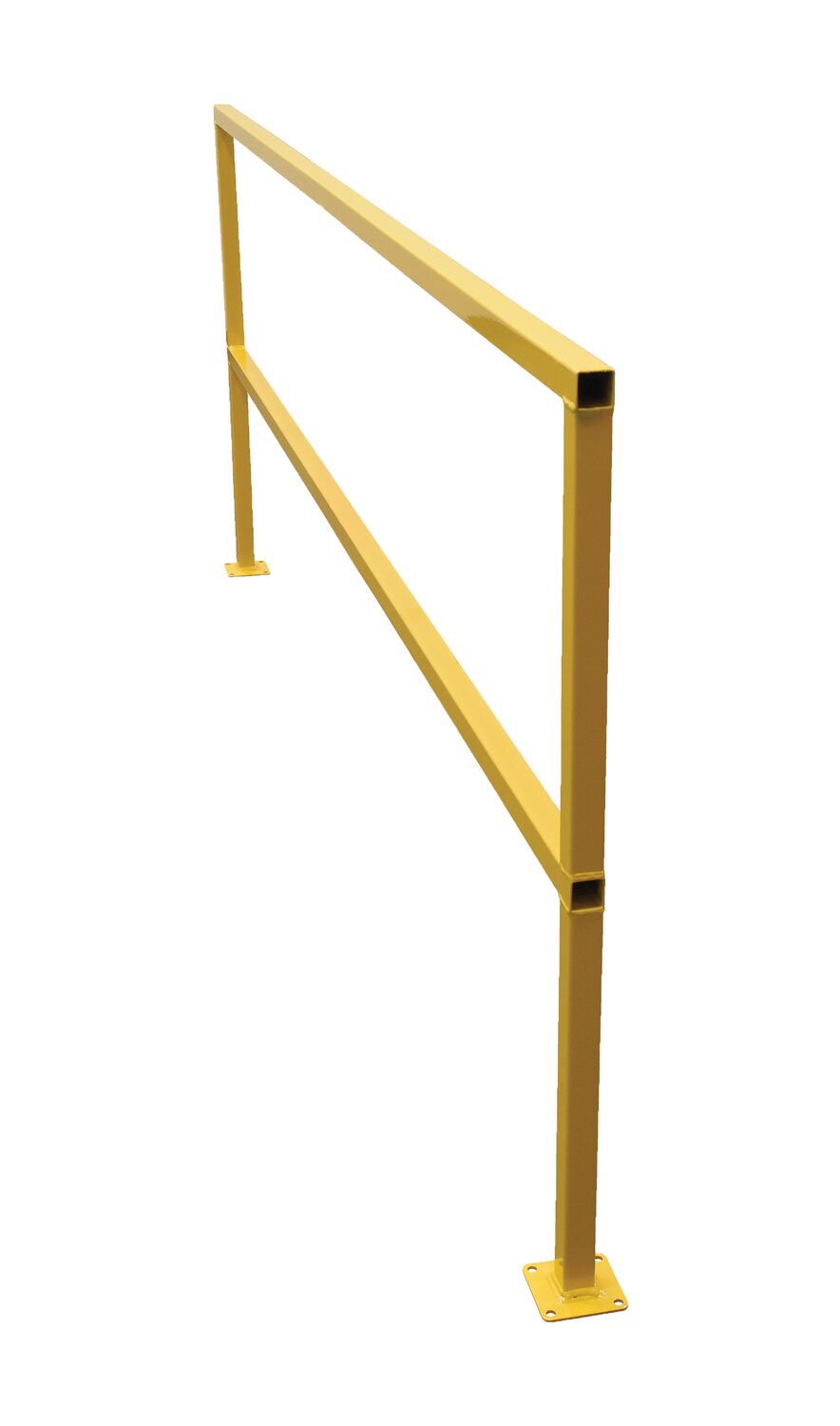 Steel square safety Handrail provides an economical way to protect people and machinery. Applications include loading docks, floor openings, walkways, and mezzanines. Highly visible safety yellow powder coat finish.