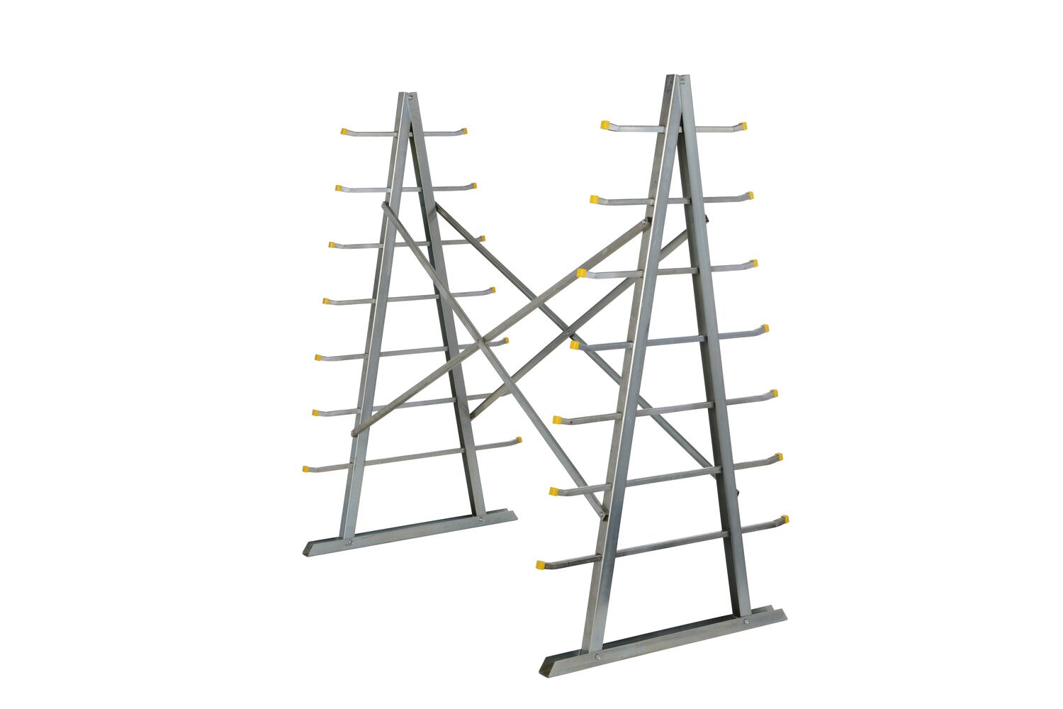A self-supporting 66" high A-frame with 7 storage levels. Arms extend up to 12" beyond A-frame. Base dimensions are 60" by 36". Rack must be statically and uniformly loaded, up to had the total system capacity per side. Each support arm must also be statically and uniformly loaded. Shipped knocked down with convenient and quick assembly. Bright zinc plated finish.