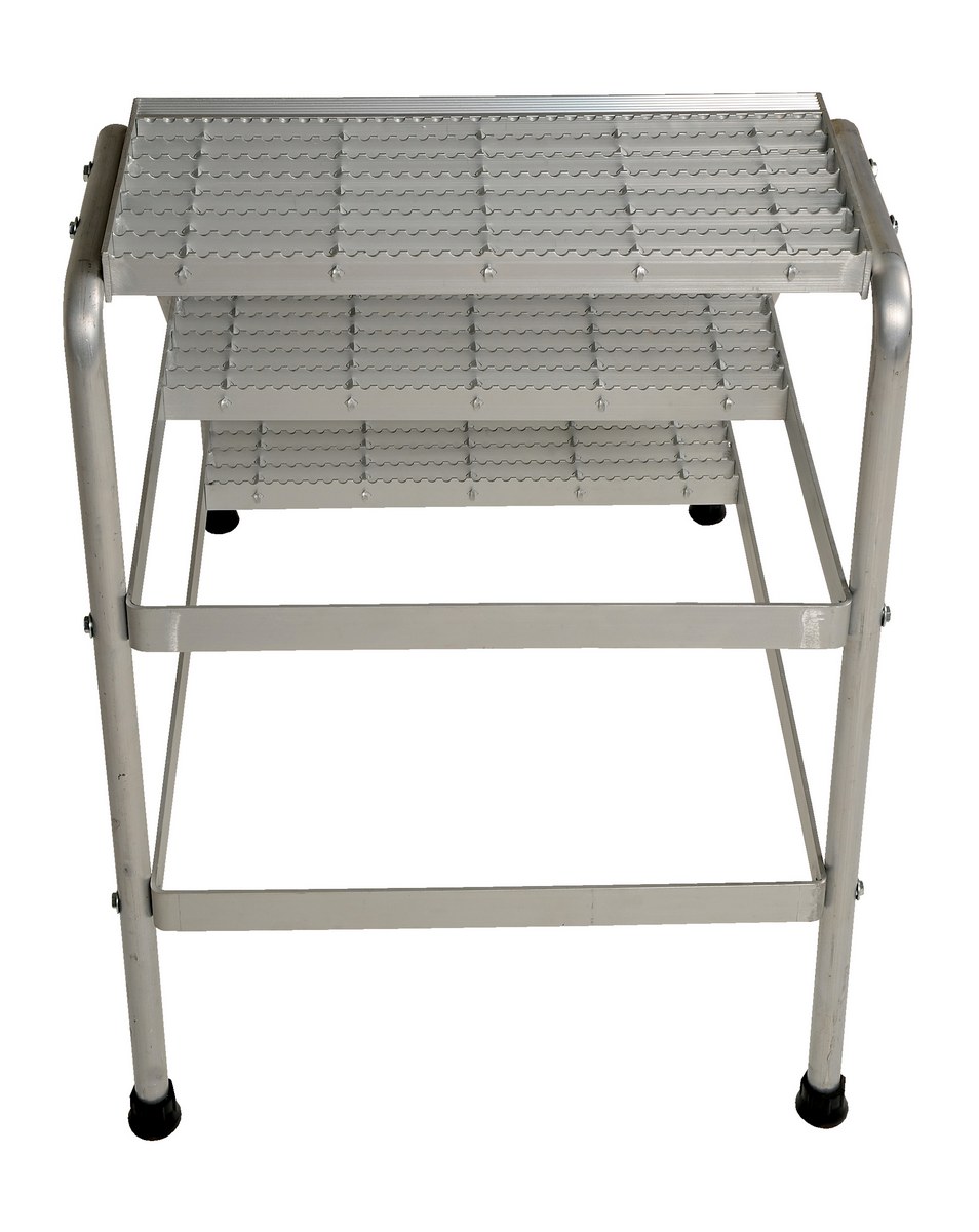 This Aluminum step stand is ideal for industrial or commercial applications. It is lighter than comparable steel models. Open step design includes extra heavy duty serrated surface for traction. With rubber tipped legs, this step ladder is ideal for use on many types floors.