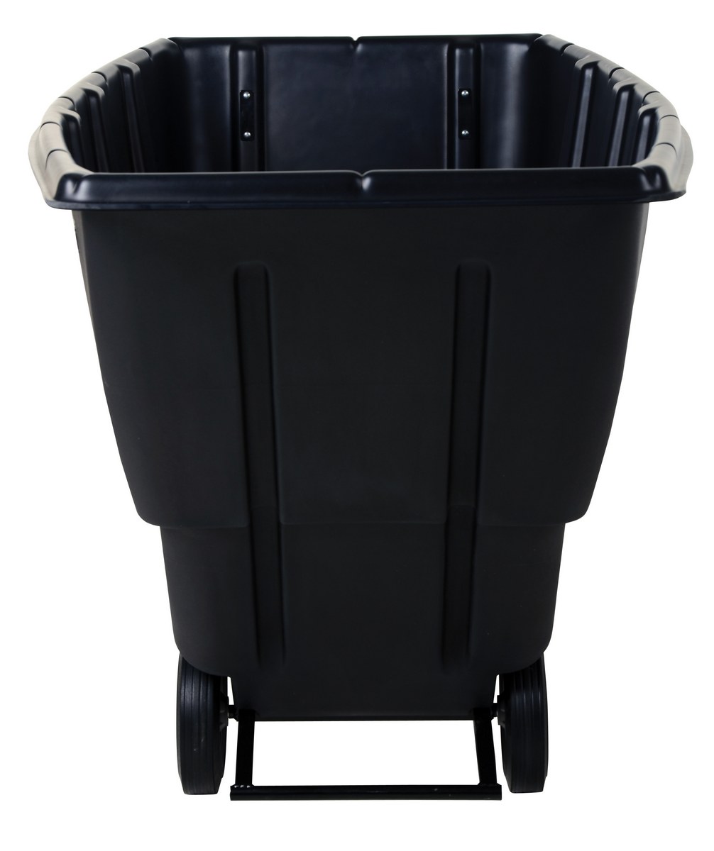 Durable plastic construction allows for collecting waste from multiple bins at a collective time. Great for warehouses, fairs, ball parks, schools, etc. Strong, one-piece molded polyethylene body with steel base tip support and a balanced design to allow for simple dumping by one person. Easily portable on 2 large rubber wheels and two swivel wheels. Not for use with fork trucks. Black color design.