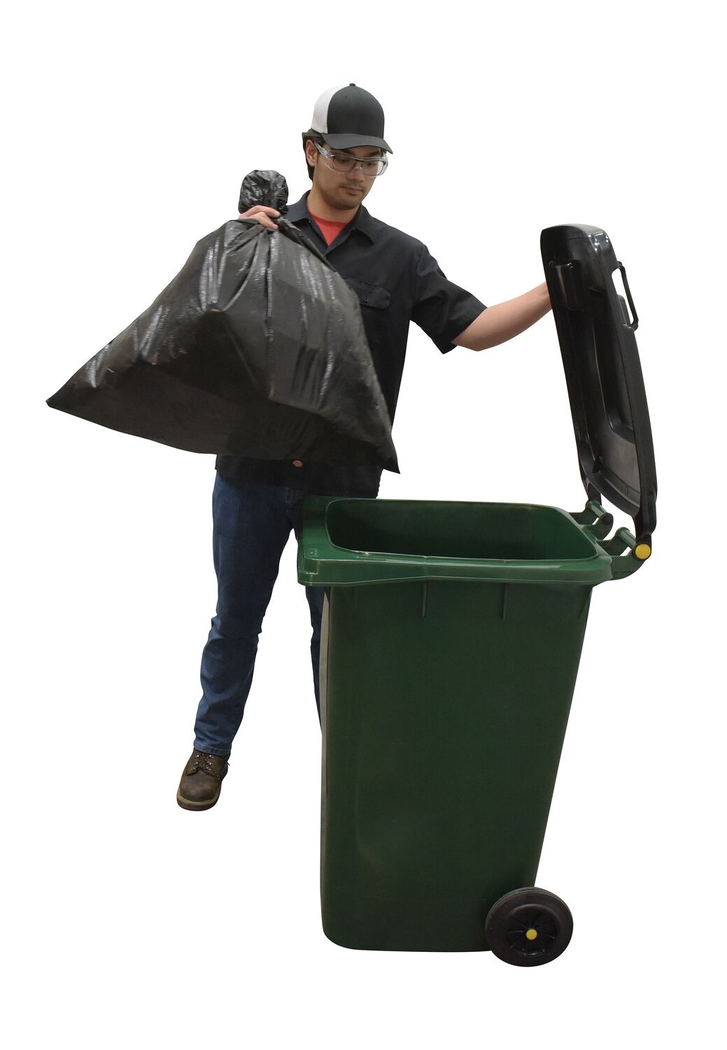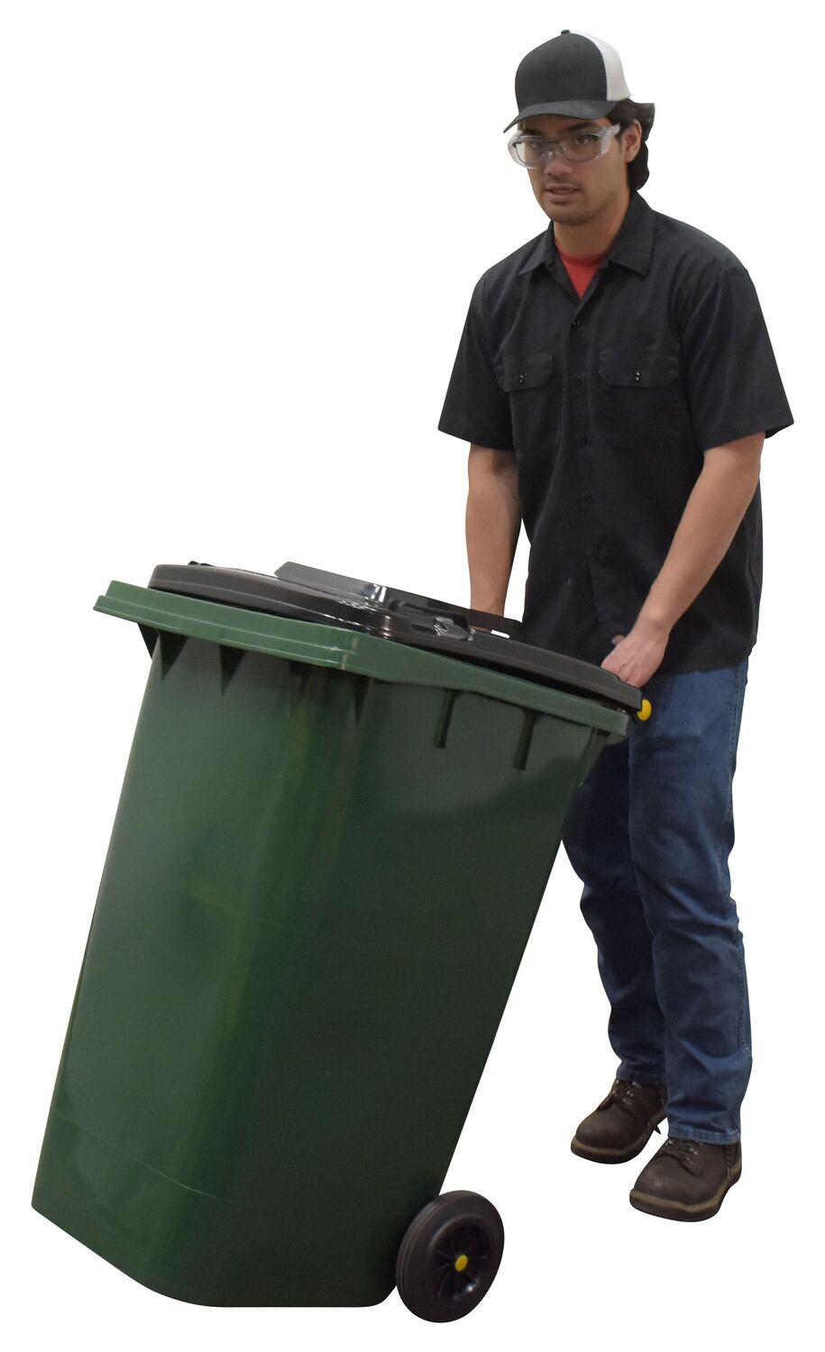 High Density Polyethylene 64 Gallon Trash Can GreenThe trash can is constructed of durable polyethylene that withstands subzero cold and extreme summer heat. Great for high traffic areas such as: warehouses, fairs, ball parks, schools, etc. Each container includes two (2) wheels for easy portability and hinged lips to keep the rain out. Keep your waste out of eyesight in our heavy-duty and easy to move refuse containers.