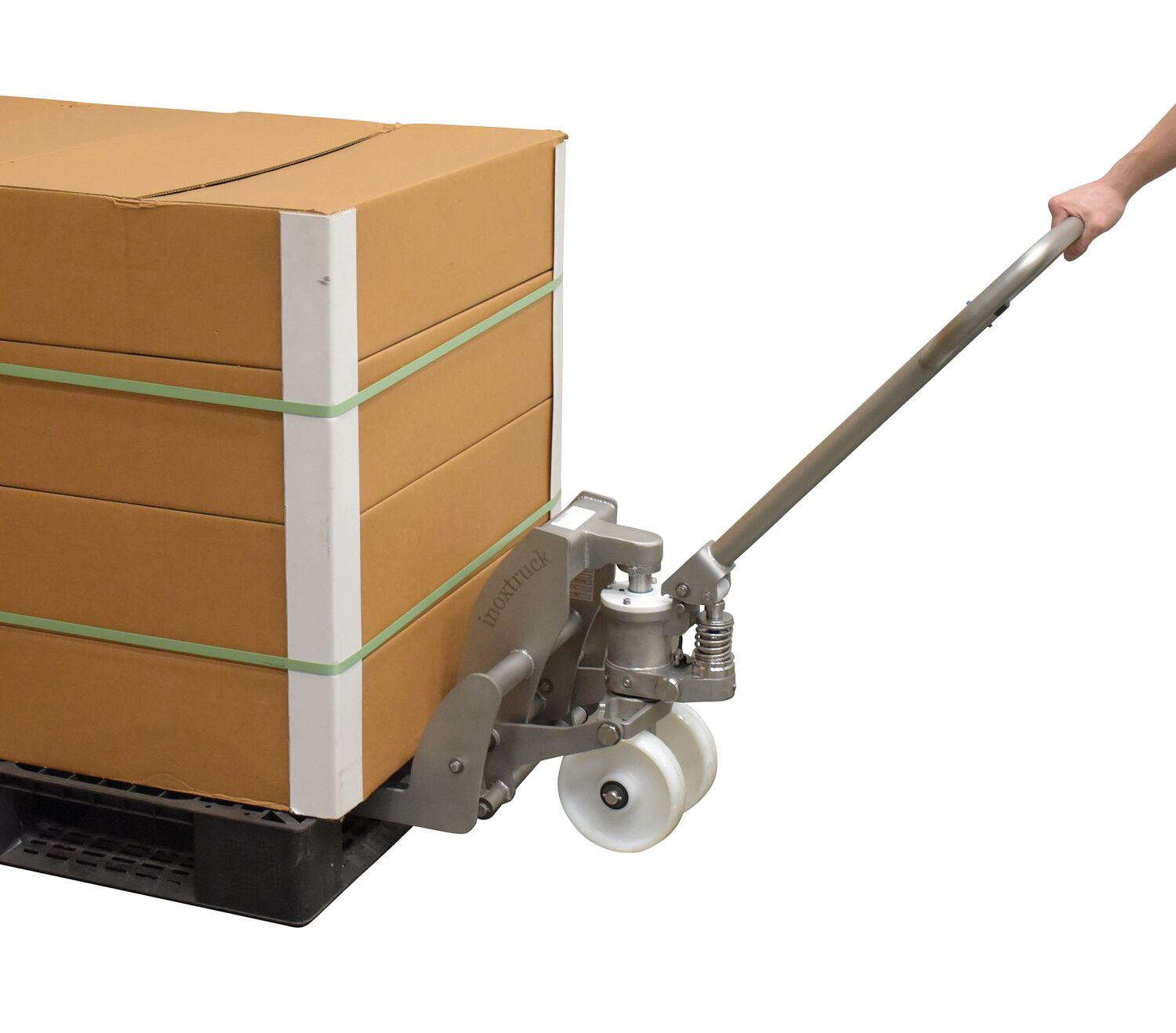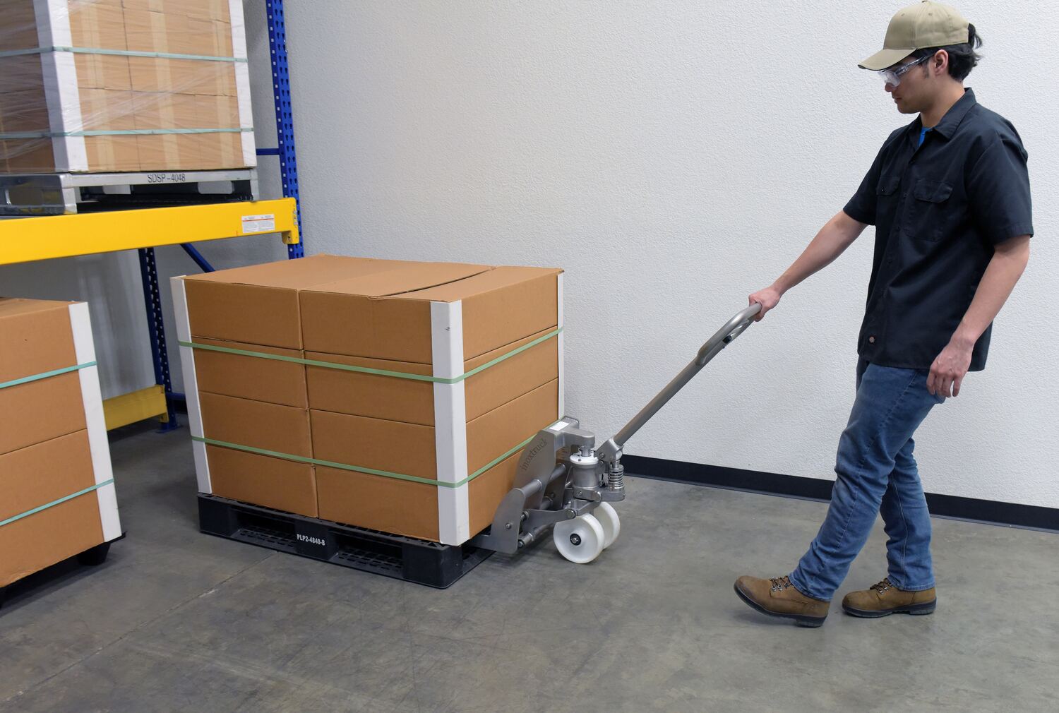 304L Stainless Steel Hydraulic Hand Pump Pallet Jack 20 in. X 45 in. 3,300 Lb. Capacity SilverThe Stainless Steel Hydraulic hand pump pallet jack works well food handling and other hygienic environments. The stainless steel construction including hydraulic cylinders and piston, is not only strong, but also simple to clean. With its open fork design,the jack can be thoroughly detailed before/after transferring products. The height of the ergonomically friendly handle diminishes slouching and can be rotated for simple maneuvering of products down narrow corridors and pathways. All bearings are sealed for waterproof protection during both use and cleaning.