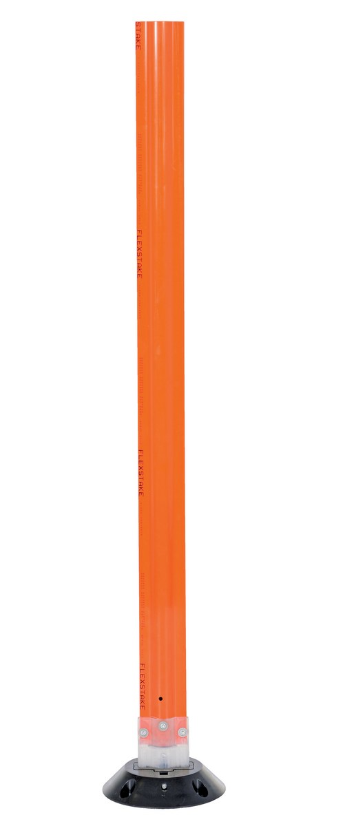 Polycarbonate Surface Flexible Stakes 48 In. x 3-1/4 In. OrangeA surface mount flexible stake is ideal for high traffic and high impact locations. Constructed of polycarbonate extrusion and flexible hinge which makes it virtually indestructible. Easy four (4) part assembly which is the post and hinge, base, grips and pin. Quick to install, they can be mounted to concrete, asphalt, wood and other hard surfaces using appropriate hardware (not included). FAA approved.