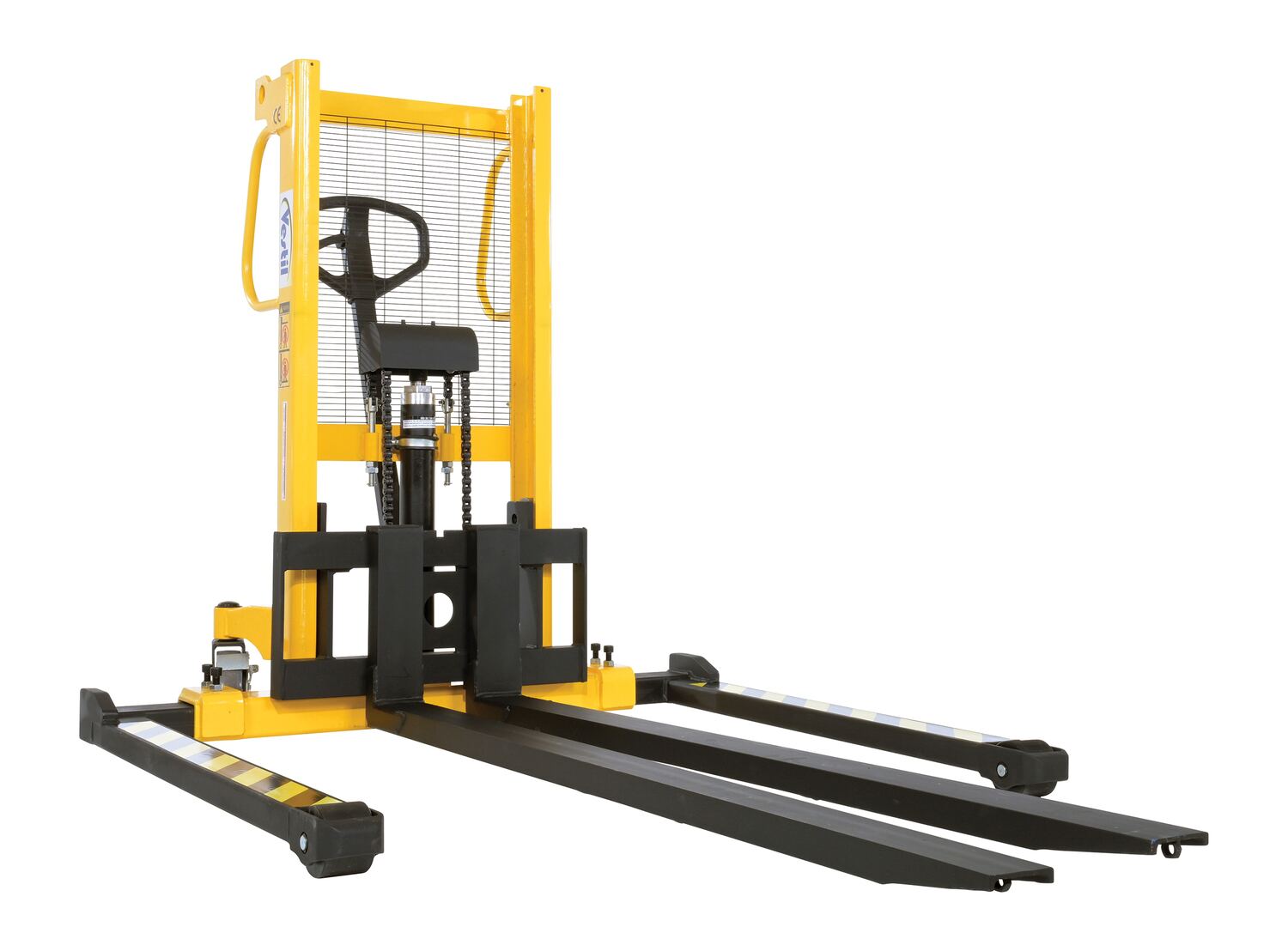 Steel Manual Stacker Adjustable Forks/Legs 550 Lb. Capacity Black / YellowThe manual stacker is designed to meet the most challenging tasks. Ideal for use in various workstation and workplace applications. The full height push handle allows for easy steering and excellent visibility through a welded mesh guard with an optional removable platform also available. It features a heavy-duty mast and a unique winch design for easier and safer lifting. The lifting and lowering is completed by a manual hand pump operation.