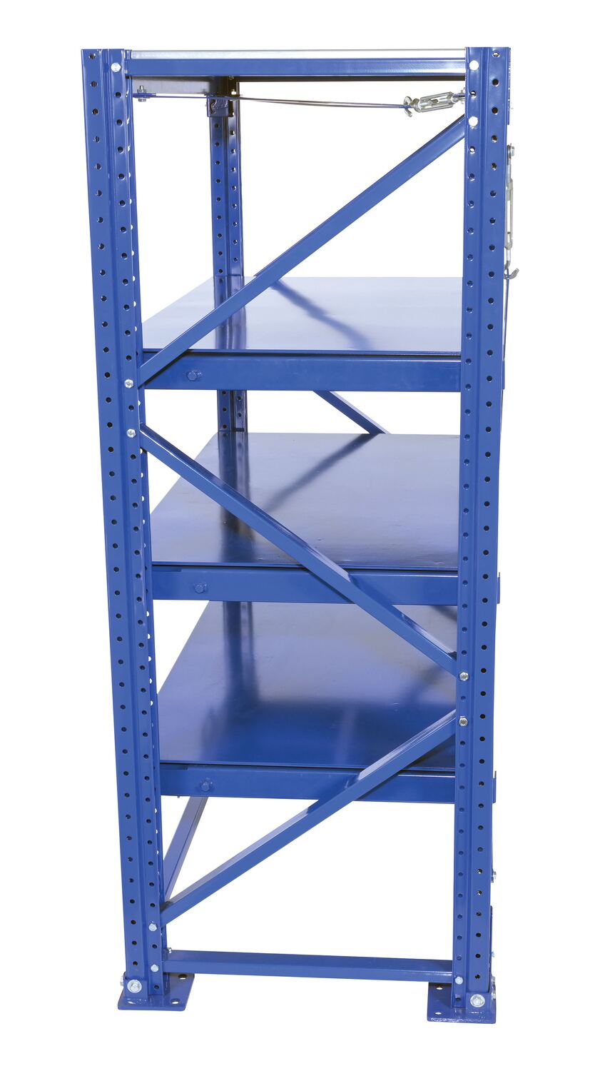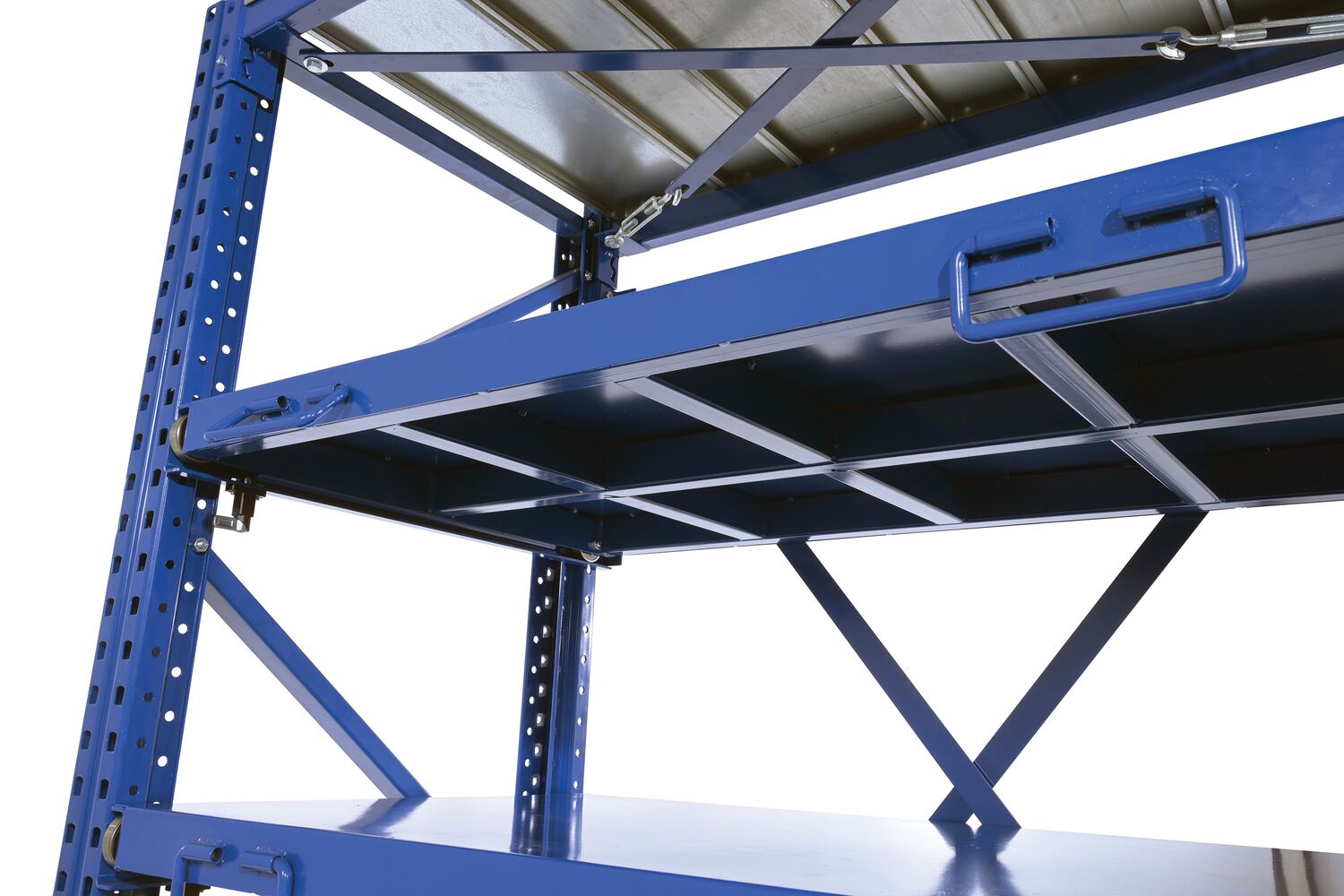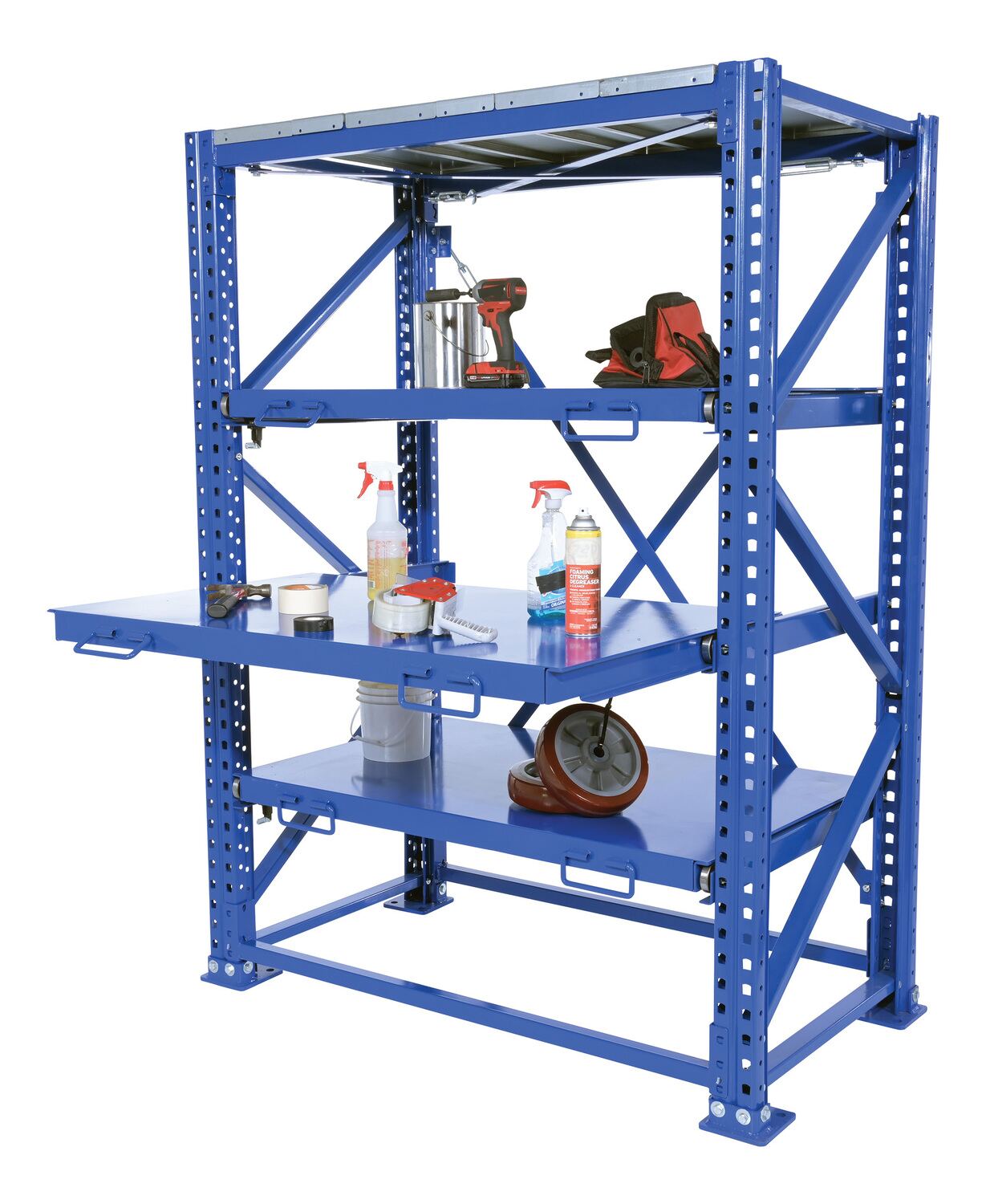 Steel Heavy Duty Roll-Out Shelving 32L X 60W X 80H 3,000 Lb. Capacity BlueHeavy Duty roll-out shelving supports and stores heavy dies, fixtures and machinery. Shelves should be rolled out one at a time for simple product placement, as well as, personnel safety. All steel construction with powder coat finish. Mounting holes are pre drilled. Assembly hardware is included. Mounting hardware is available separately.
