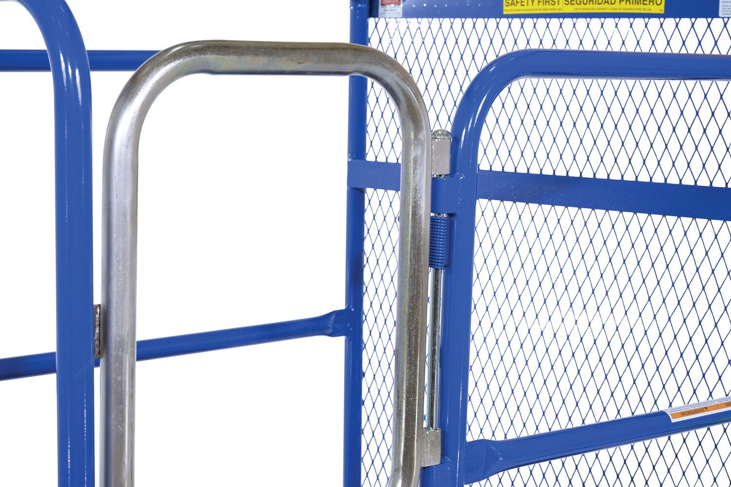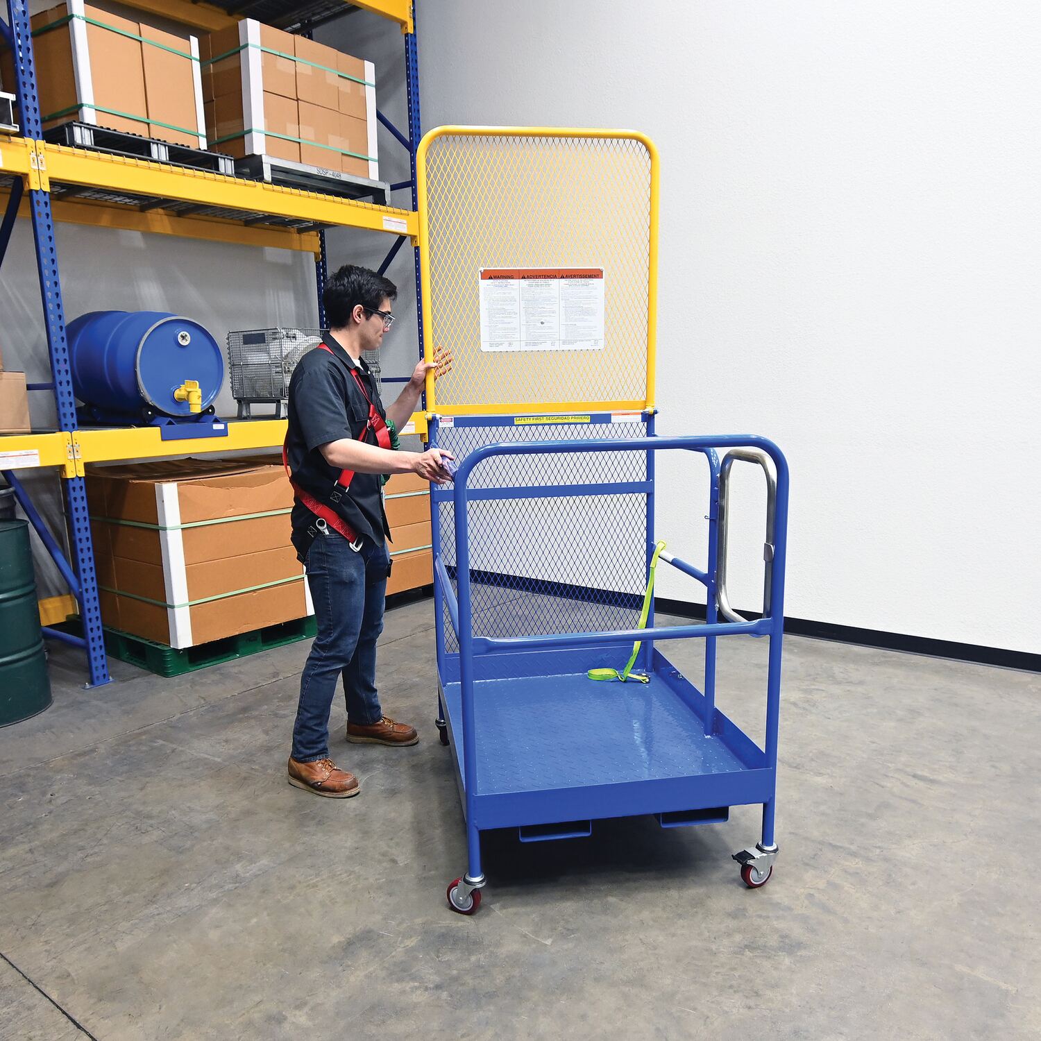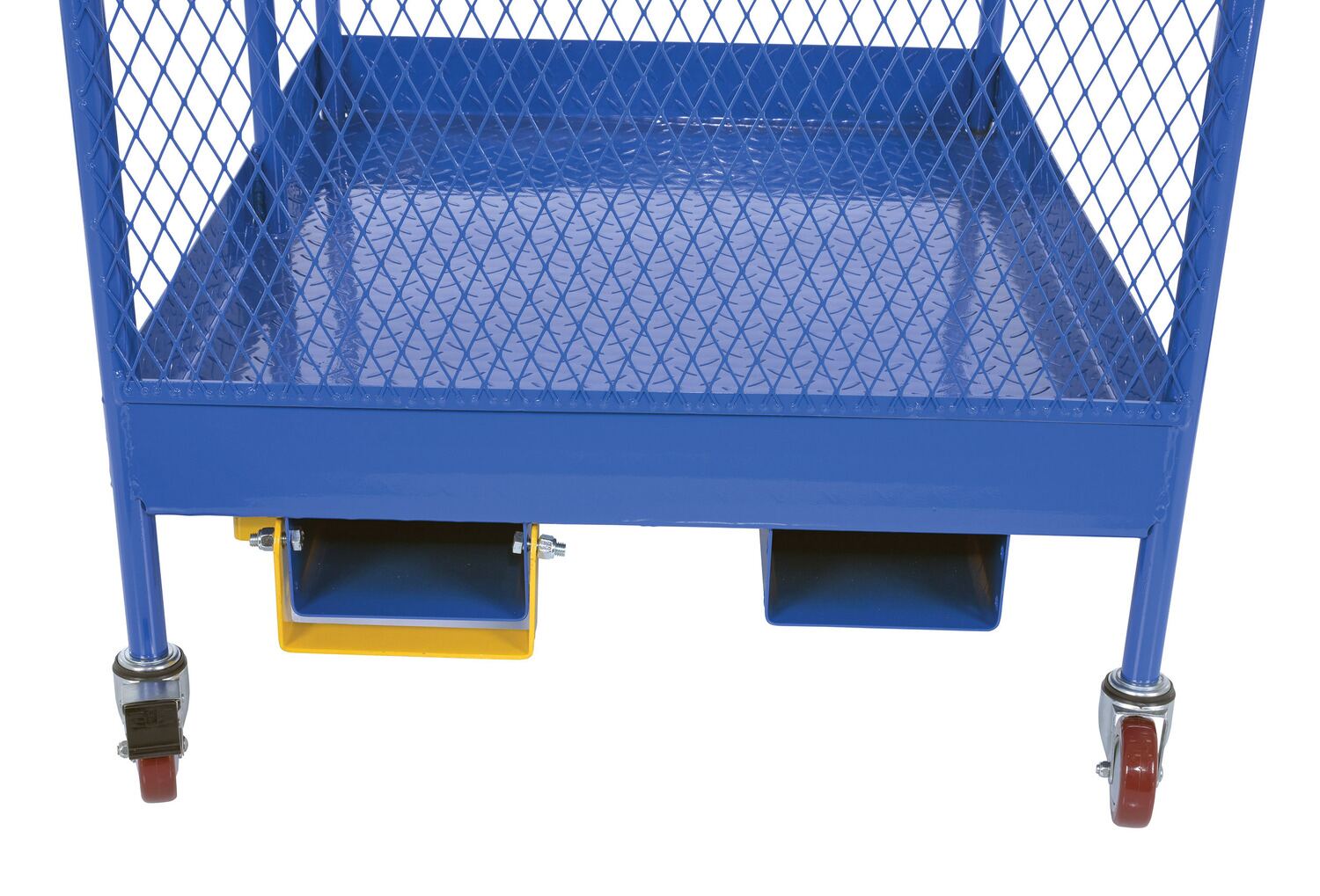 Steel Work Platform With Poly Casters and 84 In. Expanded Back 36 In. x 48 In. 1,000 Lb. Capacity BlueThis convenient fork truck work platform quickly and safely raises maintenance personnel where they are needed. Attaches to fork truck by inserting forks into fork pockets and securing platform to fork truck. Fork locks secure platform to forks. Dual handrails on three (3) sides with expanded metal backing on the fourth side. Includes checker floor plate platform and long strap with hook to attach platform to fork truck. A maximum of two (2) people can be in the work platform at one time. Includes (4) four poly swivel casters. Meets California OSHA specifications.